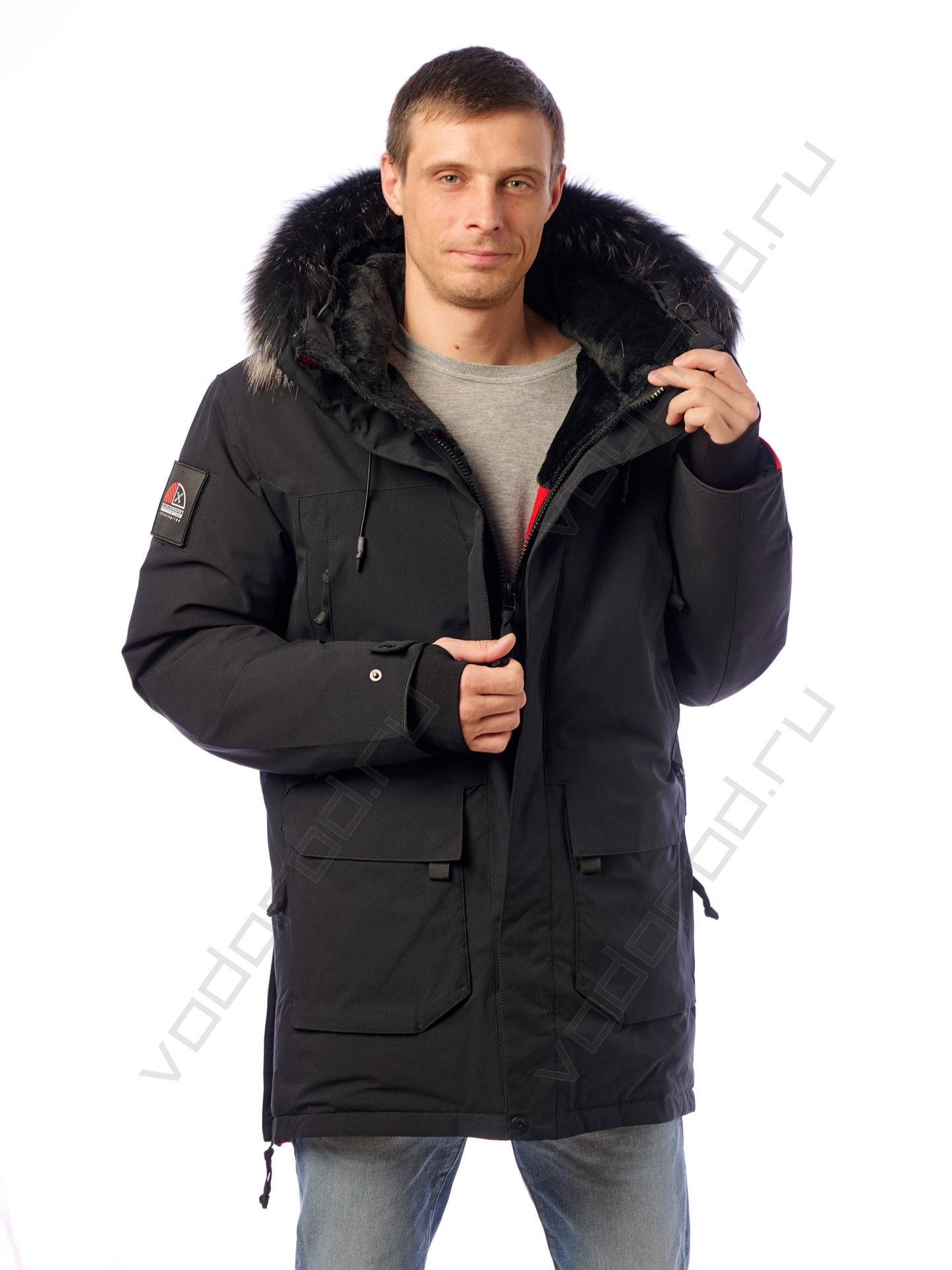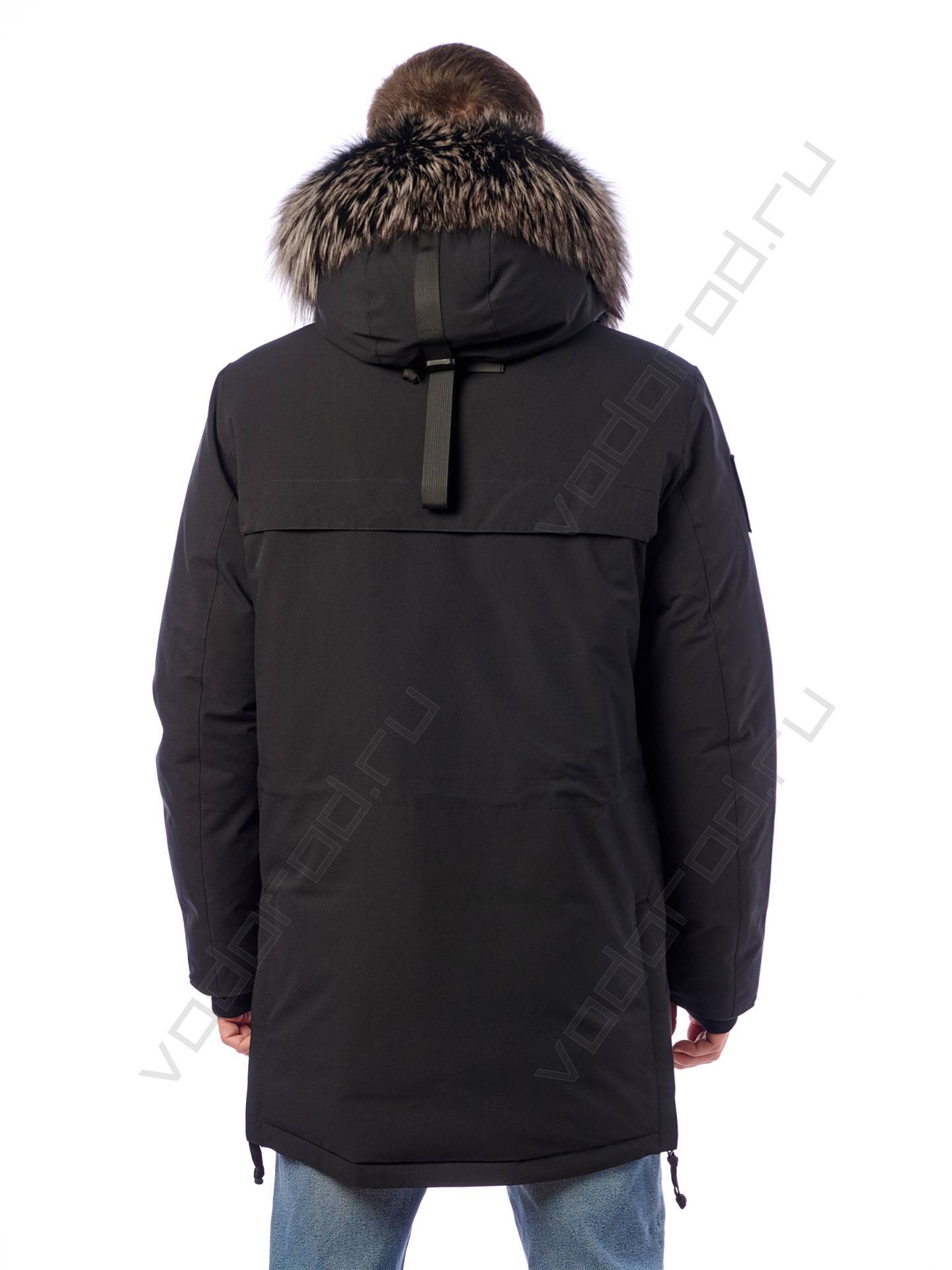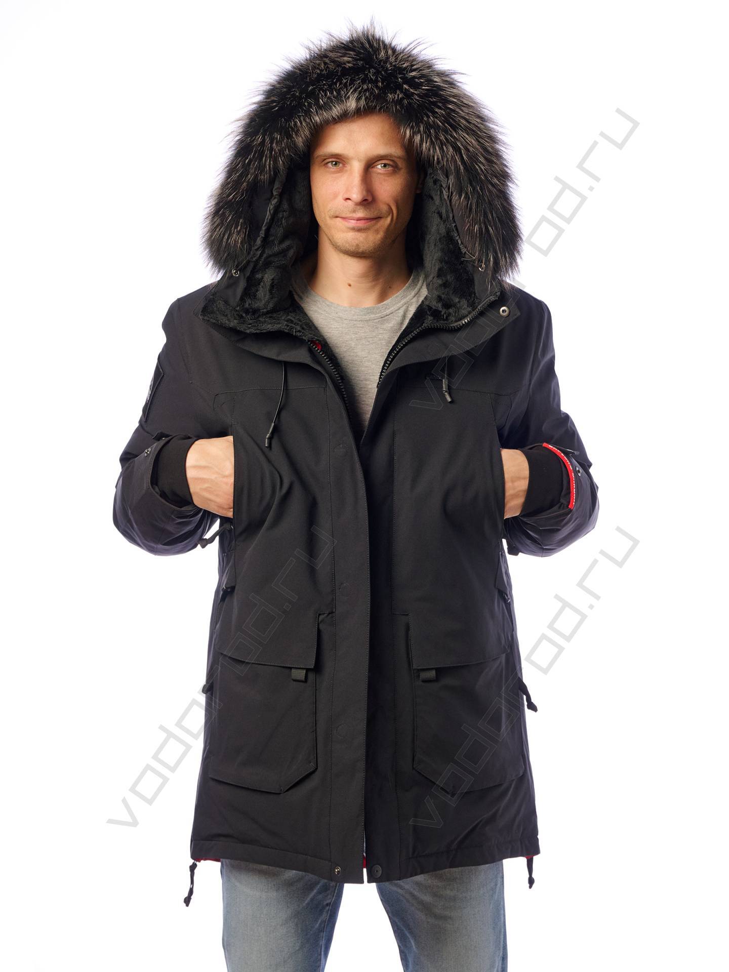Куртка имеет воротник стойку с отделкой из искусственного меха, переходящий в несъемный регулируемый капюшон с опушкой из натурального меха - чернобурка, мех съемный.